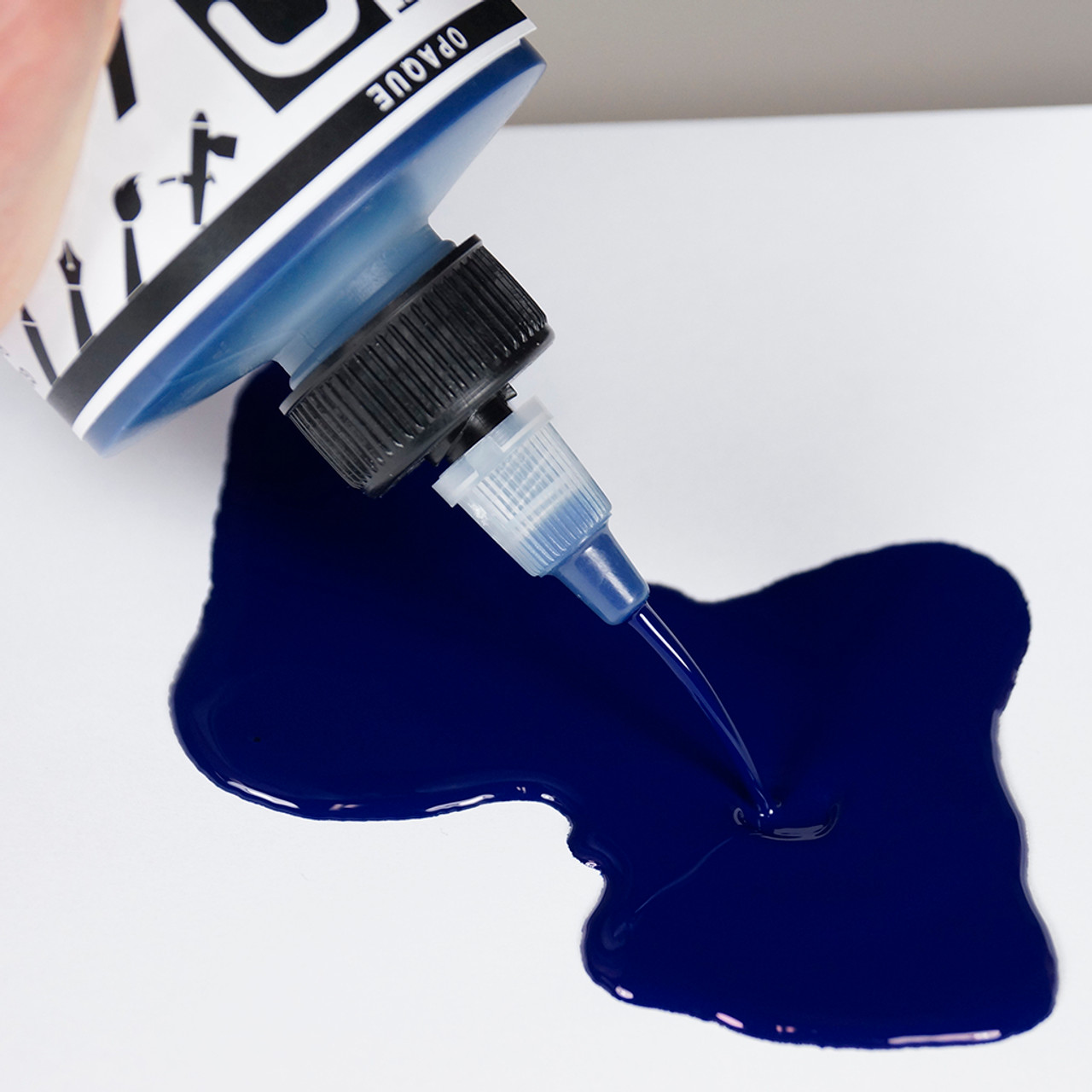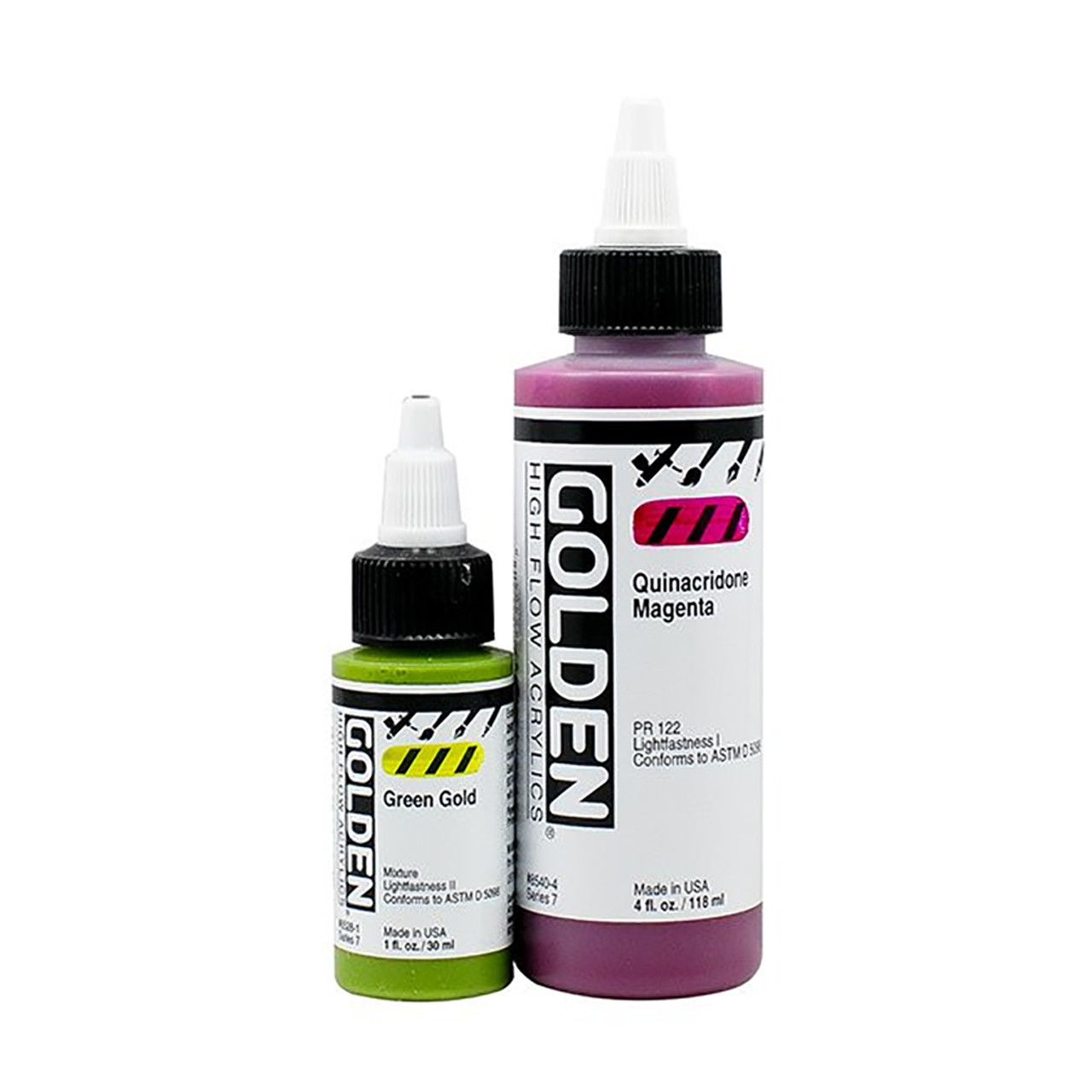 High Flow offers a palette that includes many single-pigment colors, as well as Fluorescent & Iridescent colors. While it acts like an ink, it’s an acrylic so it's compatible with Golden Acrylic Mediums.