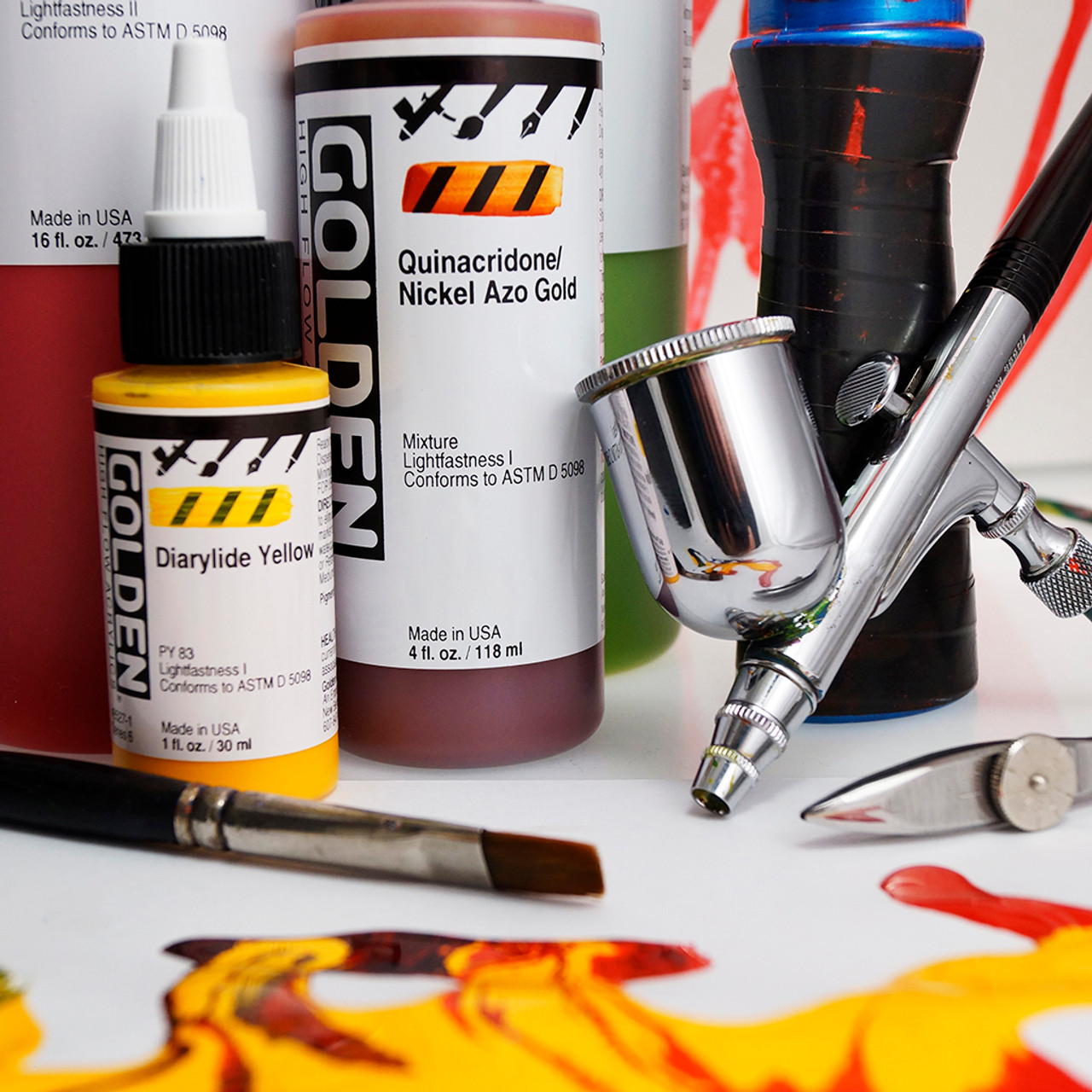 Golden High Flow Acrylics are ultra-thin paints with an ink-like consistency that provide incredible versatility. They can go directly from bottle to airbrush, refillable marker, or dip pen and work great for drawing, staining, dripping, pouring, calligraphy, and color washes.