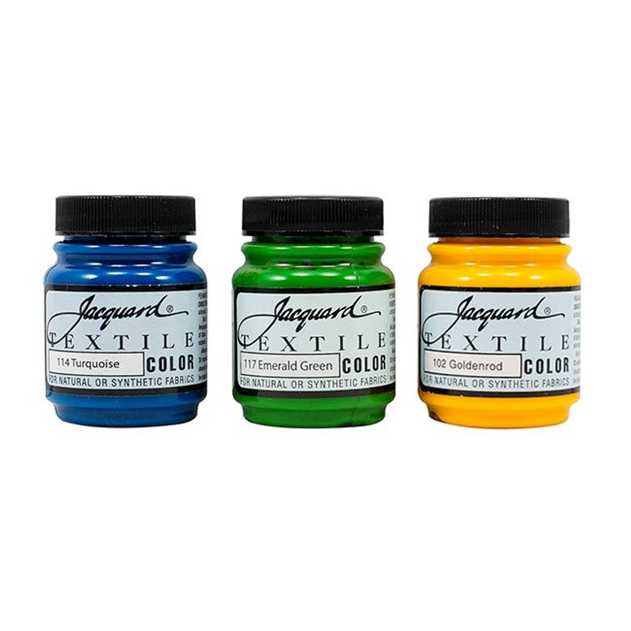 An artist’s standard for professional quality fabric paints, Jacquard Textile Colors leave fabric as soft as possible and hold up exceptionally well to washing. They are permanent when heat set and colorfast on both synthetic and natural fabrics, including stretchy fabrics, as well as on other porous and semi-porous surfaces like wood and leather. Textile Color will not chip, crack, or peel, even with repeated wear and washing.