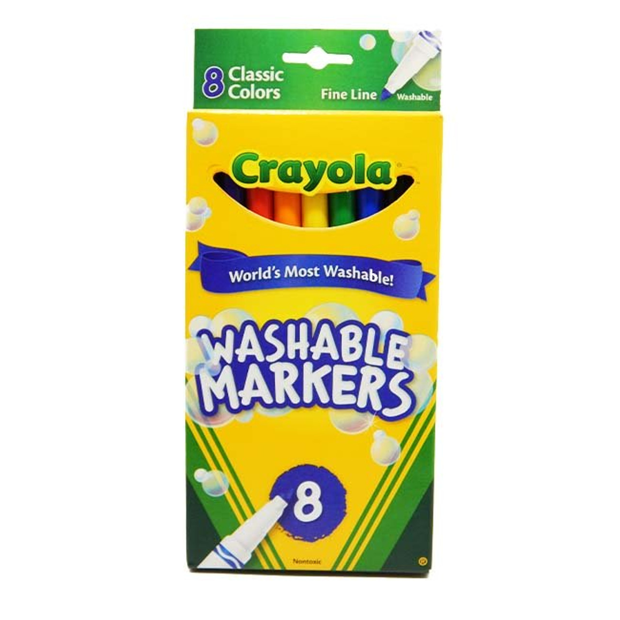 The same bright colors as regular Crayola Markers but with a truly washable formulation. They wash easily off skin and nearly all children's clothing. This set contains 8 classic colors, all with a fine tip. AP certified non-toxic. See Included Colors Below