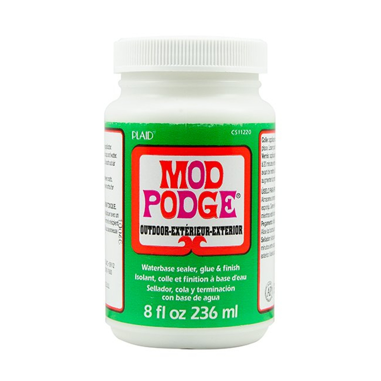 This water-based sealer, glue and finish lets you decoupage for the outdoors. It seals and protects wood, terra cotta, slate, tin and more. Dries fast & clear. In an 8 oz. bottle